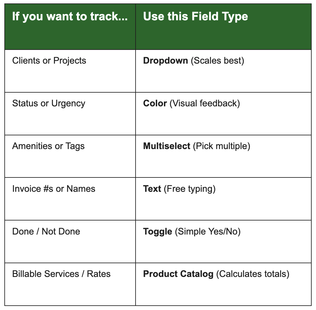 Time Reports Pro allows you to add custom data to your Google Calendar events using "Fields." Choosing the right Field Type is critical for keeping your data organized and your reports useful.